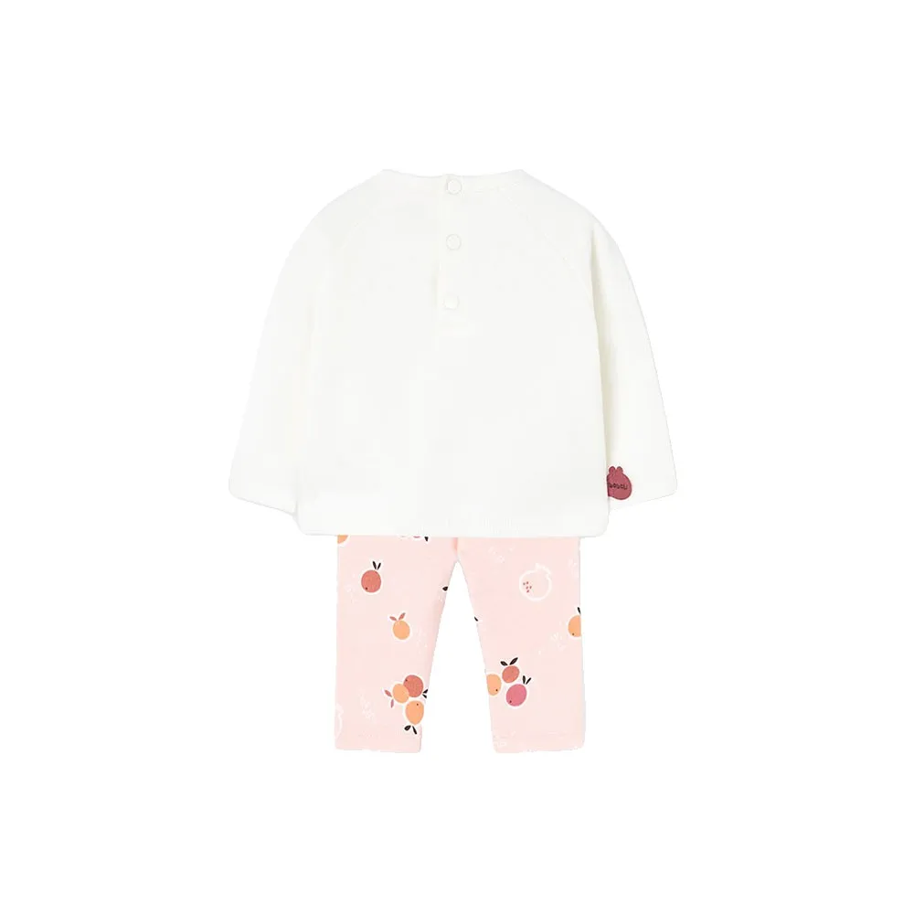 Hvitt strikket sett for jenter, dekorert med fruktmotiver, er ideelt for kalde vinterdager og kjølige dager i mellomsesongen.