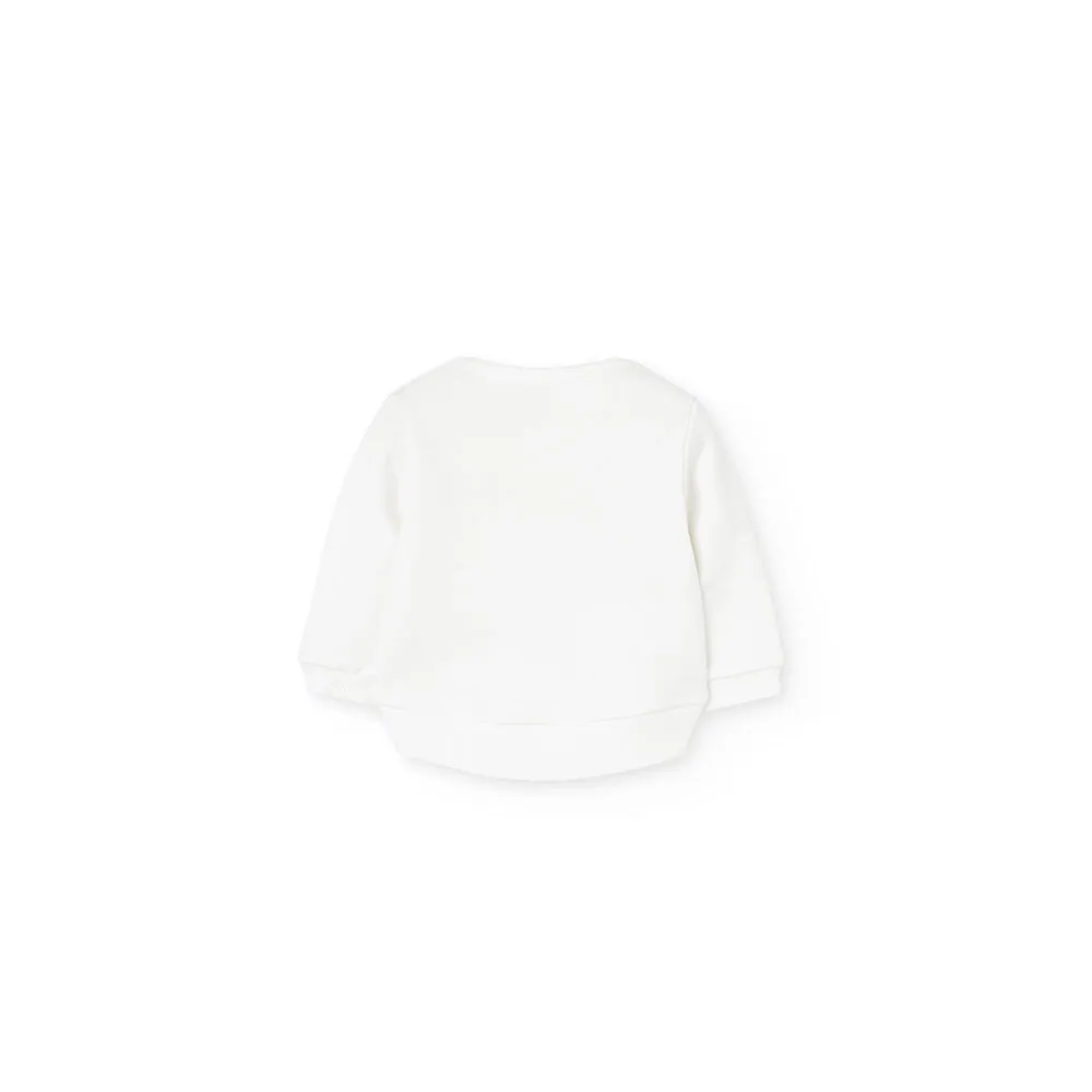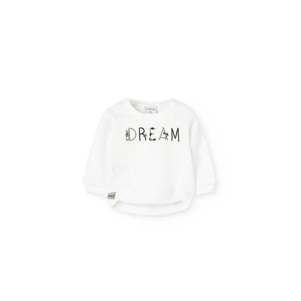 Hvit sweatshirt med ordet "DRØM" og små dyredetaljer, som gir et morsomt og sjarmerende preg.