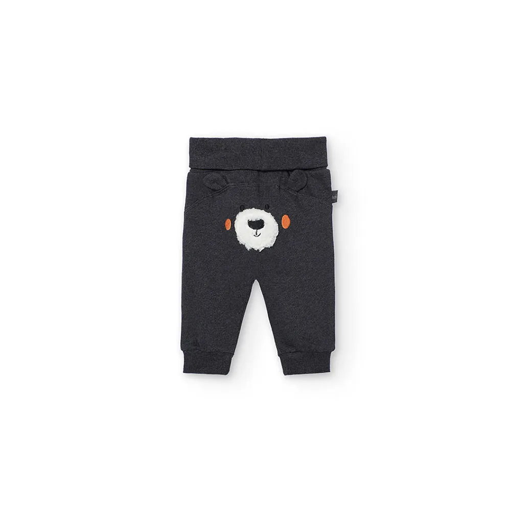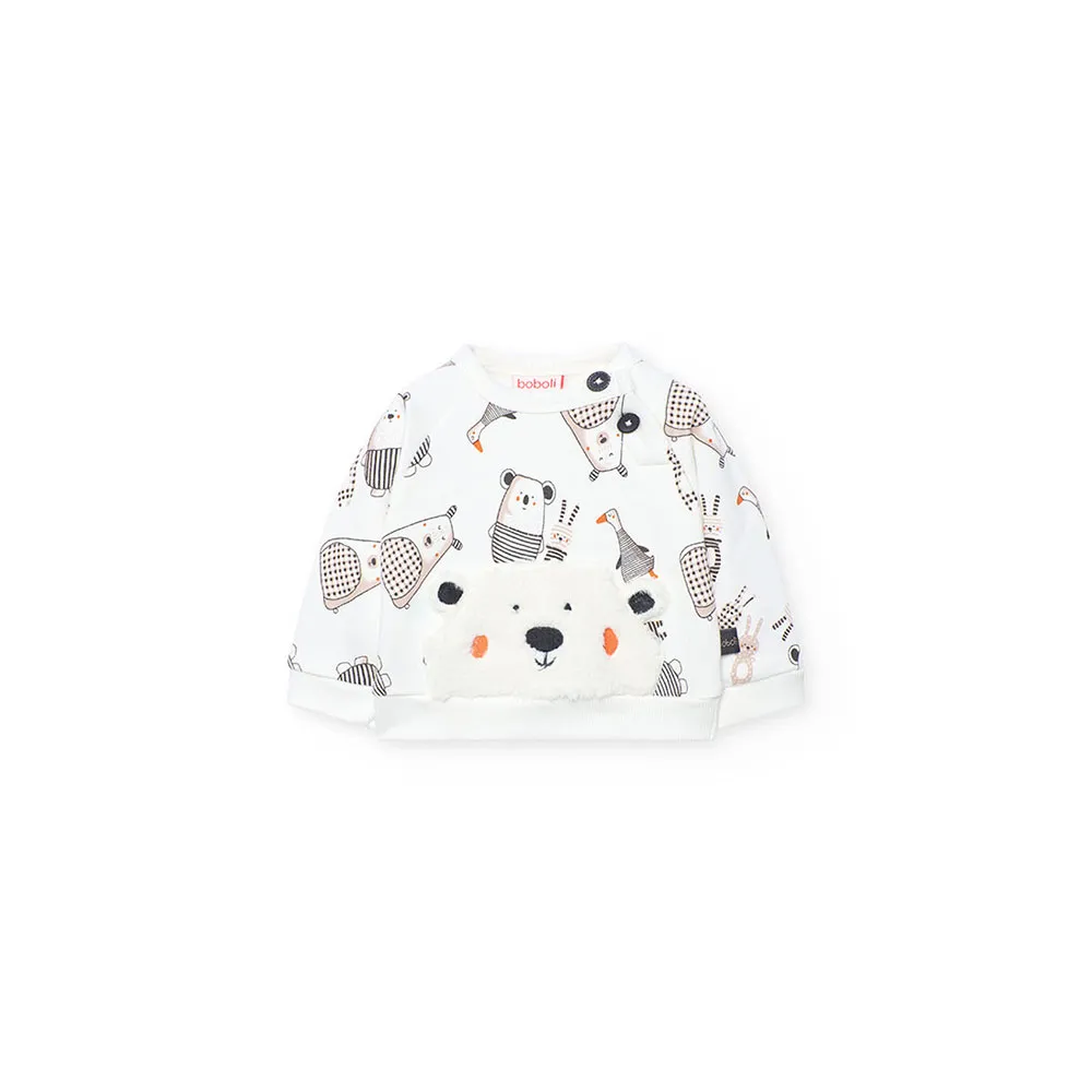 Hvit genser med et bedårende dyreprint og en bjørn-applikasjon i fleece, mens buksene er mørkegrå.
