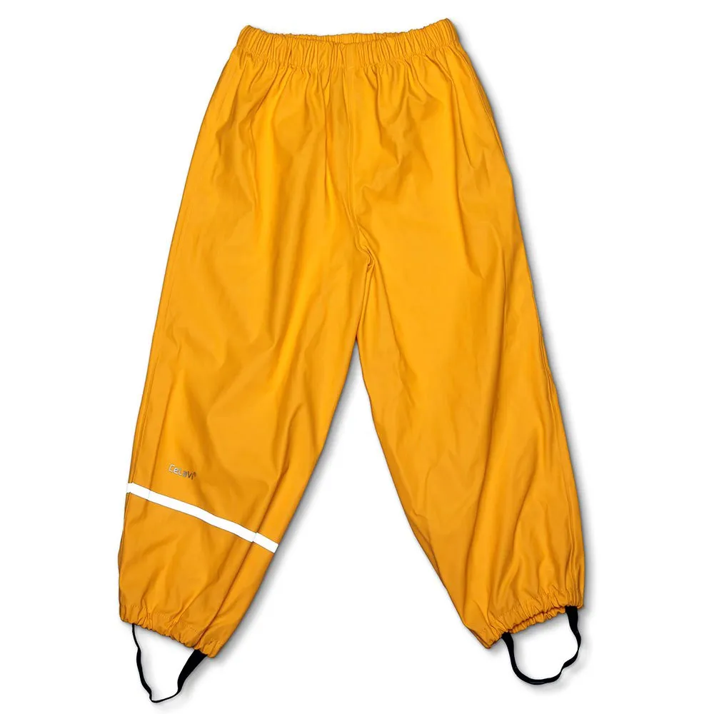 I størrelse 110-150, men i noen farger opp til 170, kommer regnbuksene med elastisk midje (størrelse 110-140) og kun Celavi-logo på bryst og ben.