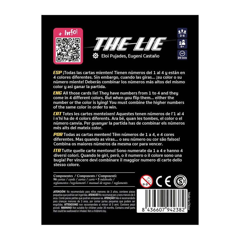Løgn er et spennende kortspill designet av Eloi Pujades og Eugeni Castaño, ideelt for 2 til 6 spillere fra 8 år og oppover. Kortene har tall og farger, men når du snur dem ... endres noe! Ditt oppdrag vil være å danne numeriske kombinasjoner av samme farge og gå tom for kort før de andre. Med enkle regler, 20-minutters spill og en "liggende revers" som gir tilfeldigheter, er Løgn perfekt for alle aldre. Lær raskt, utfordre oppfinnsomheten din og nyt den fantastiske spillbarheten. Tør du å oppdage løgnene?
