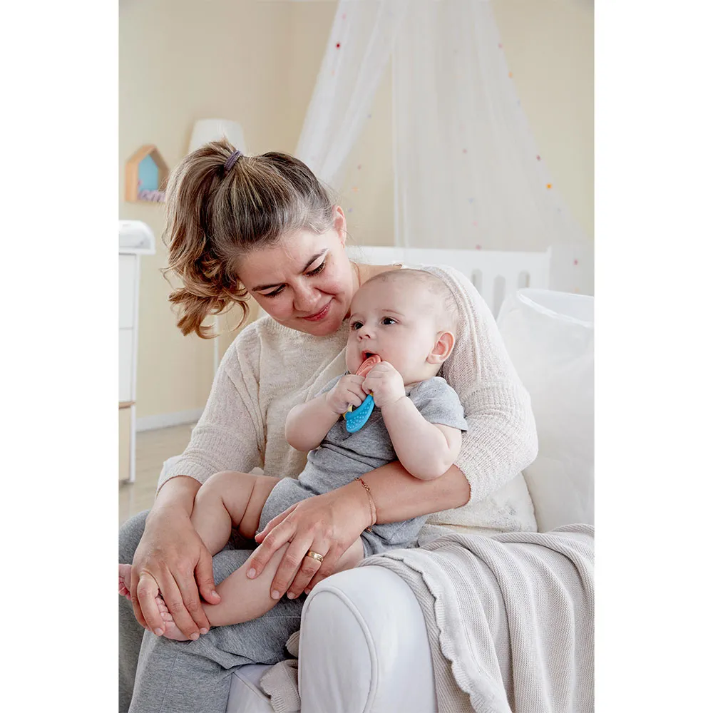 Den er trefarget og har to deler med teksturer som er perfekte for å gripe eller bite i.