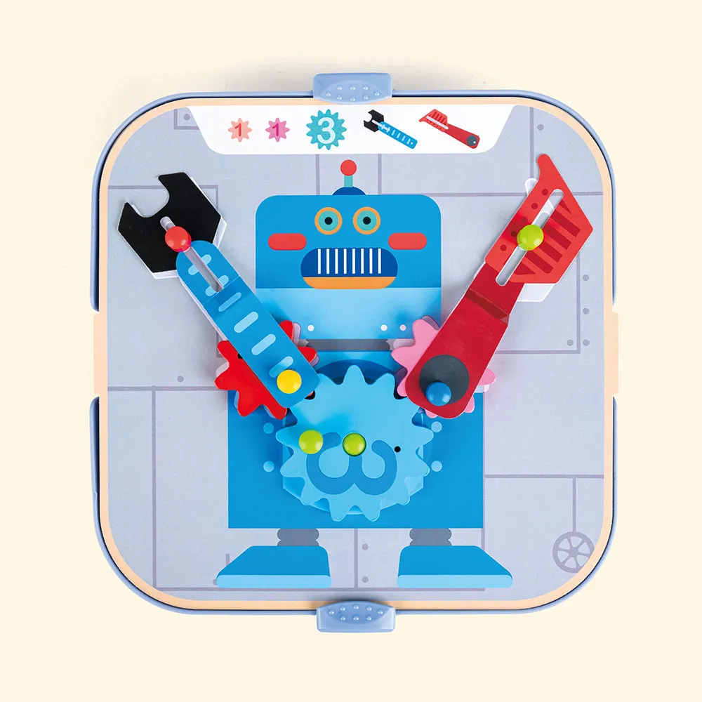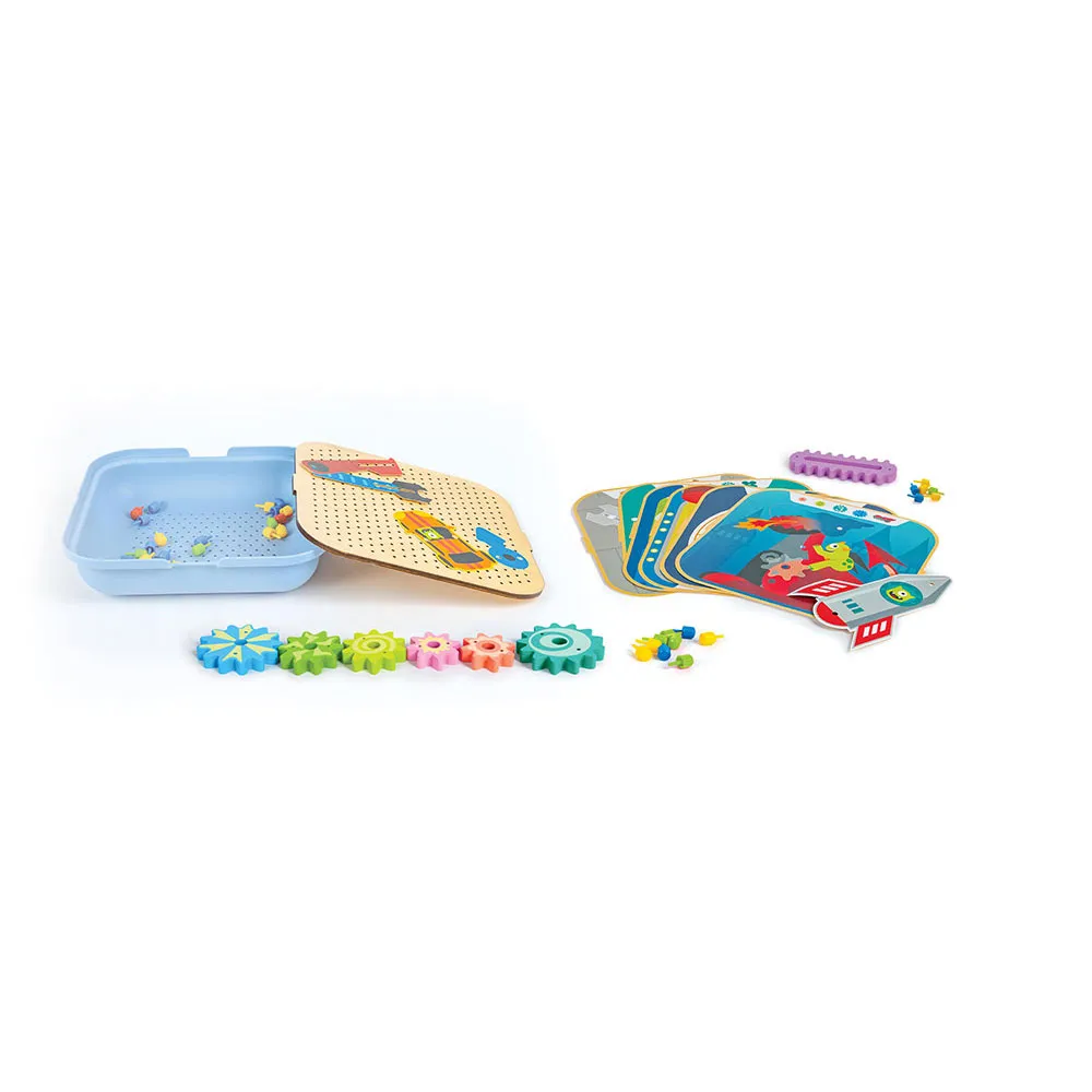 Lek, vri og la deg forbløffe av dette fantastiske lekesettet! Plasser pinnene, tannhjulene og pappfigurene på en av de seks bakgrunnene og vekk dem til live ved å dreie på tannhjulene! HAPE Gearsett er mer enn bare et leketøy; det er en dynamisk, praktisk introduksjon til den fascinerende verdenen av mekanikk og bevegelse, designet for å fange og utdanne unge sinn. Se hvordan barnets øyne lyser opp når de kobler sammen tannhjulene, gir ett et forsiktig spinn, og ser hele kreasjonen deres springe ut i et synkronisert, spinnende skue.