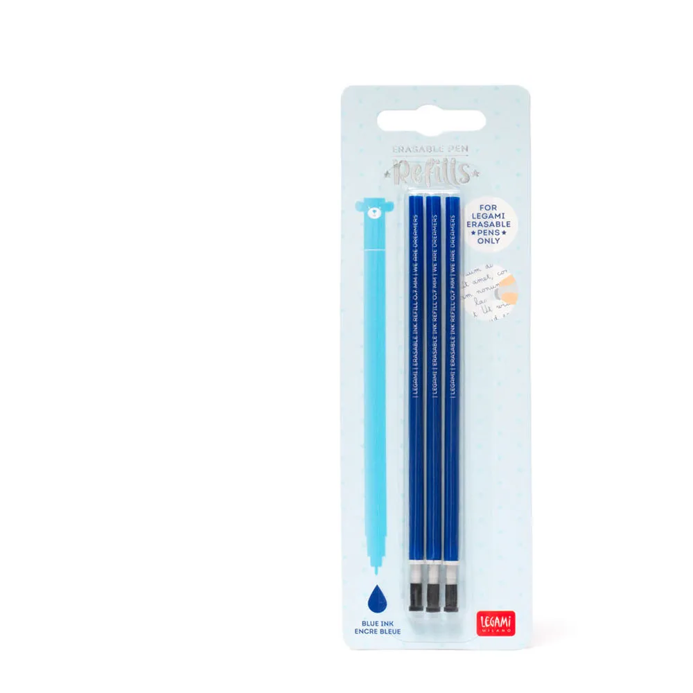 Har din favoritt viskelærpenn gått tom for blekk? Ikke kast den: fyll den opp. Tre blå blekkpatroner for Legami viskelærgelpenner. Lyst på en forandring? Miks og match patronene for å bruke pennen din i en helt ny farge.