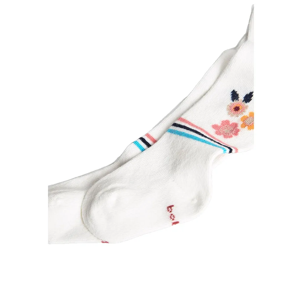 Białe, dziergane rajstopy dla niemowląt ozdobione subtelnymi kwiatowymi detalami, które dodają uroku i radości.