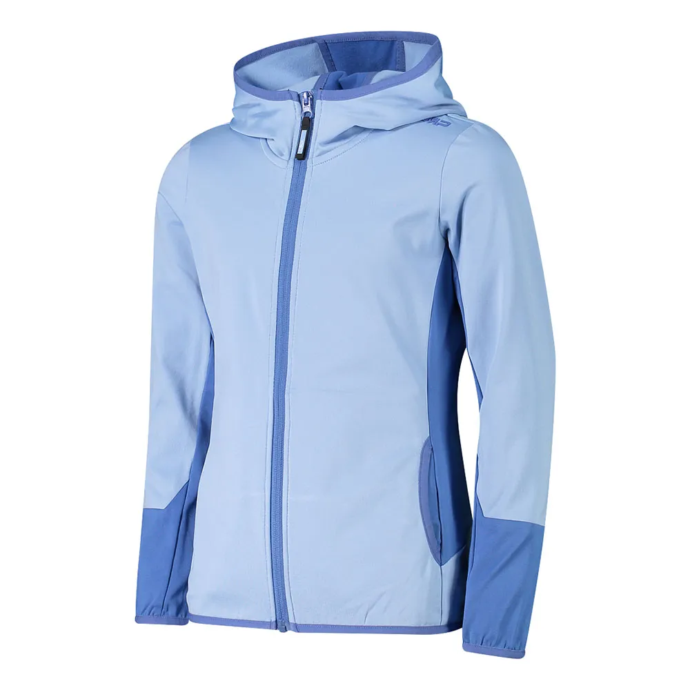 Dziewczęca kurtka z rozciągliwego poliestru ze stałym kapturem i centralnym zamkiem błyskawicznym; dół i mankiety z elastycznym ściągaczem dla lepszego dopasowania do ciała. Idealna do aktywności na świeżym powietrzu.