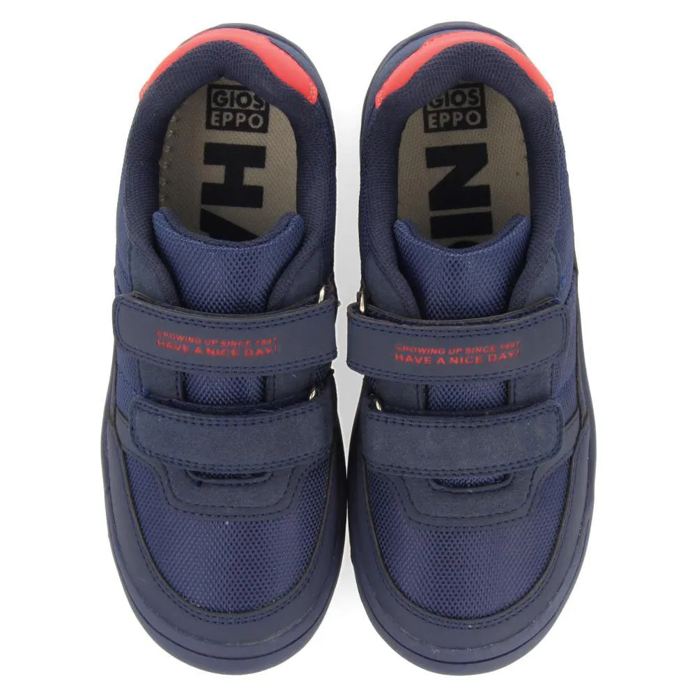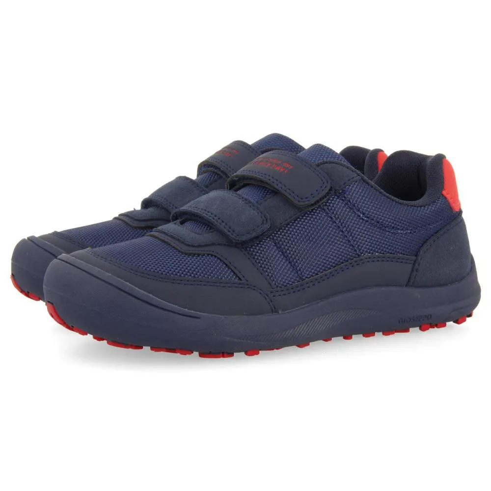 Granatowe trampki z czerwonymi detalami i regulowanym zapięciem.