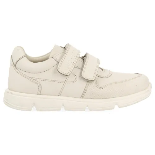 Białe skórzane trampki szkolne z regulowanym zapięciem.