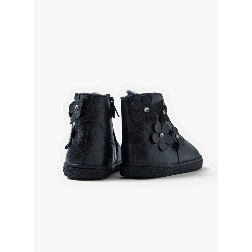 Botki do kostki ze skóry zamszowej z błyszczącymi kwiatami i zdobieniami z dżetów.