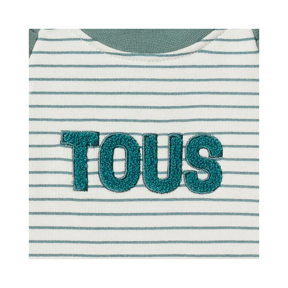 Odkryj zachwycające detale, które czynią ten strój prawdziwym skarbem. Playsuit Tous Baby z okrągłym dekoltem i długim rękawem ma nieodparcie urocze uszka na kapturze, dodające odrobinę figlarnego kaprysu, który jest idealny do uchwycenia cennych wspomnień. Wykonany z cudownie miękkiej bawełny, ten pajacyk umiejętnie łączy klasyczne gładkie i stylowe tkaniny w paski, tworząc wyrafinowaną, a jednocześnie słodką estetykę. W sercu tego ubranka, centralne haftowane logo TOUS stanowi symbol trwałej jakości i ikonicznego designu, czyniąc go jednym z najbardziej wyjątkowych body dla niemowląt, jakie Twoje maleństwo będzie nosić.