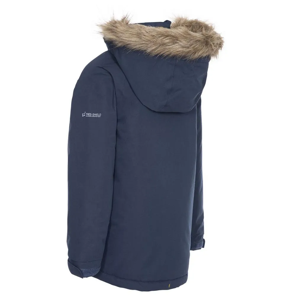 Upbeat to kurtka parka dla dzieci fachowo wykonana z wyściełaną powłoką, która zapewnia zarówno wodoodporność, jak i wiatroodporność. Posiada polarową podszewkę Sherpa, odpinany kaptur z odpinanym wykończeniem ze sztucznego futra, długie rękawy z regulowanymi zapięciami na rzepy przy mankietach, zapięcie na suwak z przodu, 2 dolne kieszenie na kopertach i 1 kontrastowa kolorowa kieszeń na zamek. Nie pozwól, aby pogoda osłabiła ich nastrój, kupuj dziecięcą kurtkę Trespass Upbeat!