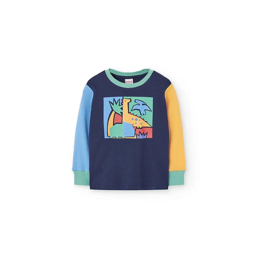 Pijama interlock com formas abstratas de dinossauros para meninos, projetado para oferecer conforto durante o descanso noturno.