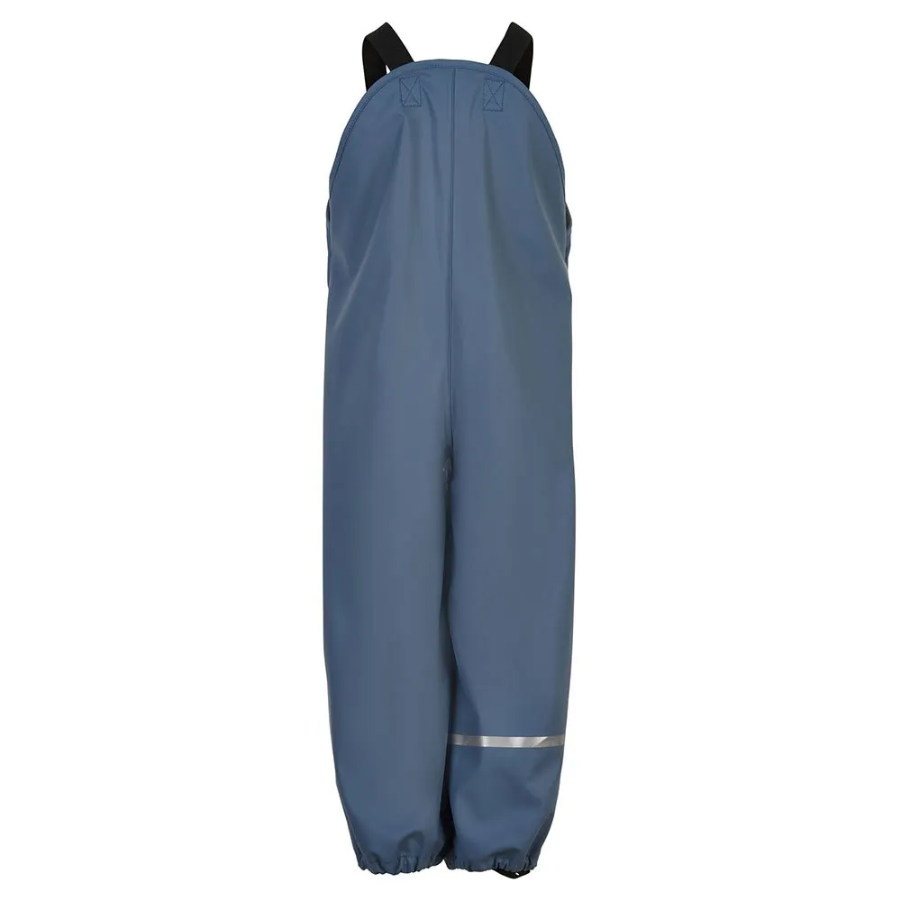Calças de chuva em poliuretano durável em poliéster reciclado com babador, suspensórios ajustáveis e fivelas de clique.