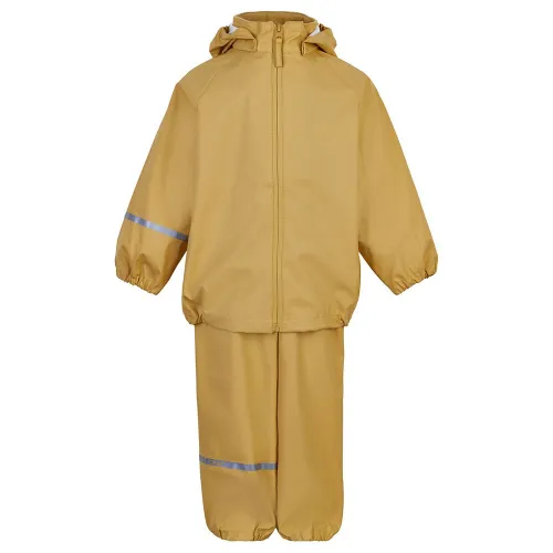 As calças de chuva nos tamanhos 70-100 têm suspensórios elásticos ajustáveis e botões de pressão em cada lado.