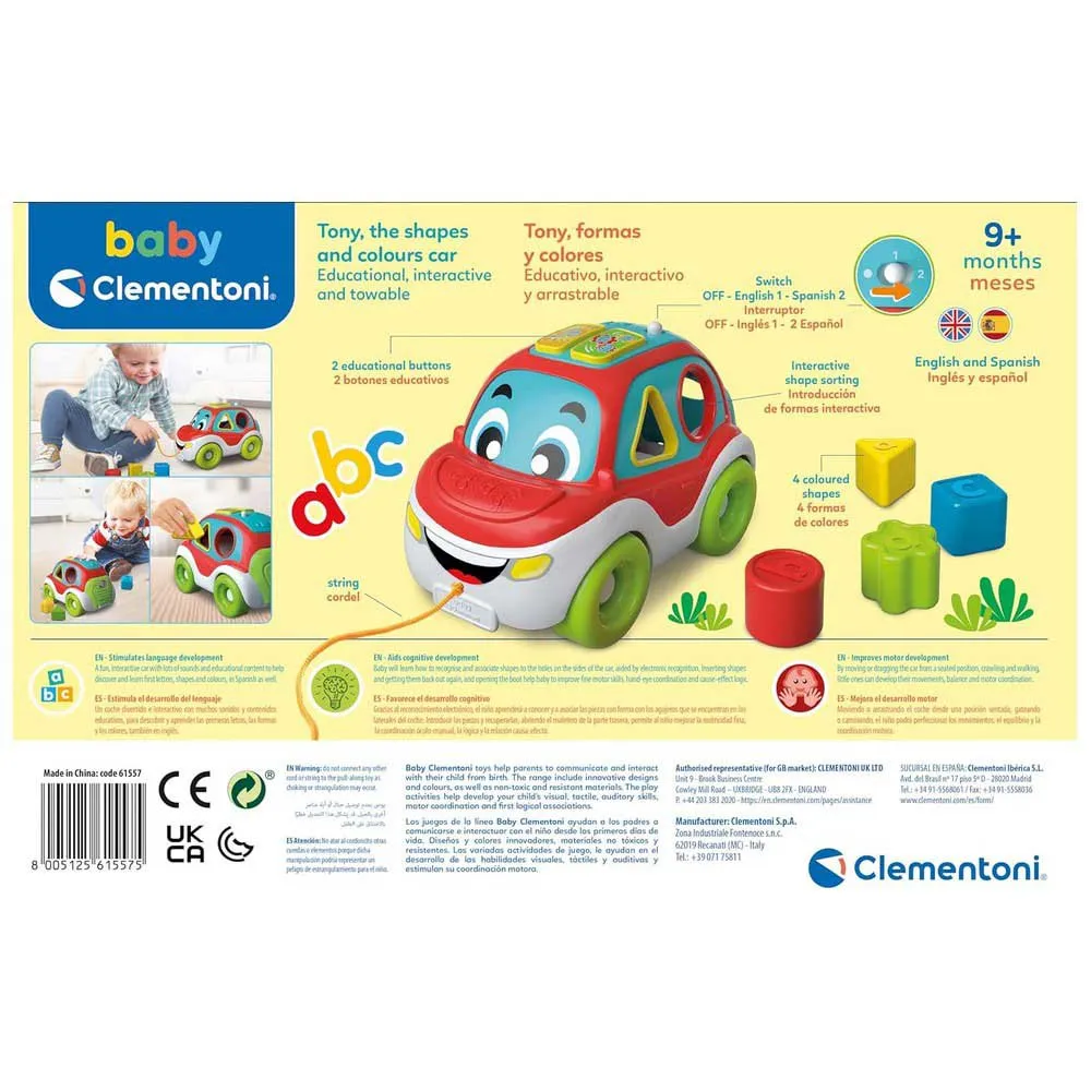 O CLEMENTONI Car Tony Shapes And é o presente perfeito para apoiar o desenvolvimento cognitivo e físico do seu filho de uma forma divertida e estimulante. É um companheiro fiável, seguro e durável para a primeira infância, concebido para crescer com o seu pequeno enquanto ele explora o mundo à sua volta.