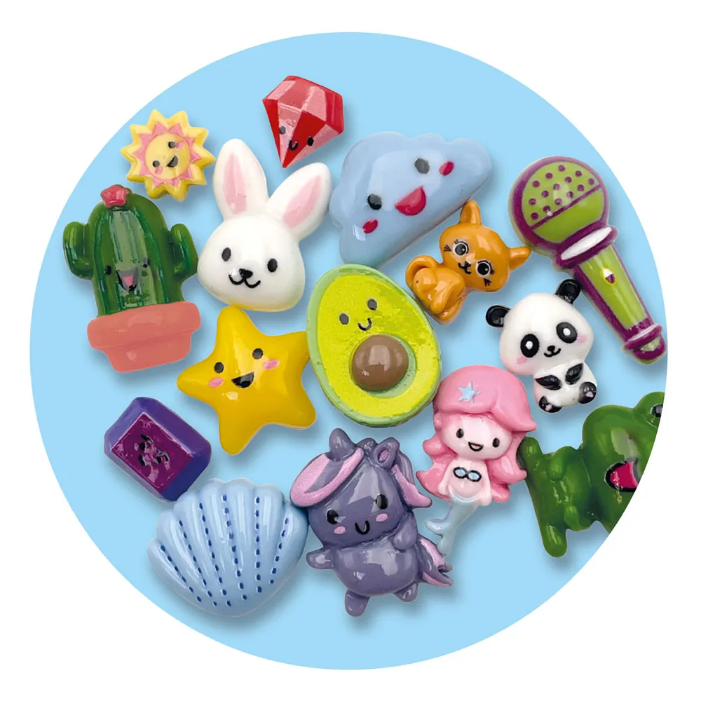3 decoden bottles, 3 nozzles, 15 charms, 75 beads, 50 gems, 1 tweezer, 10 stickers, 4 hairpins and 2 hair clips.