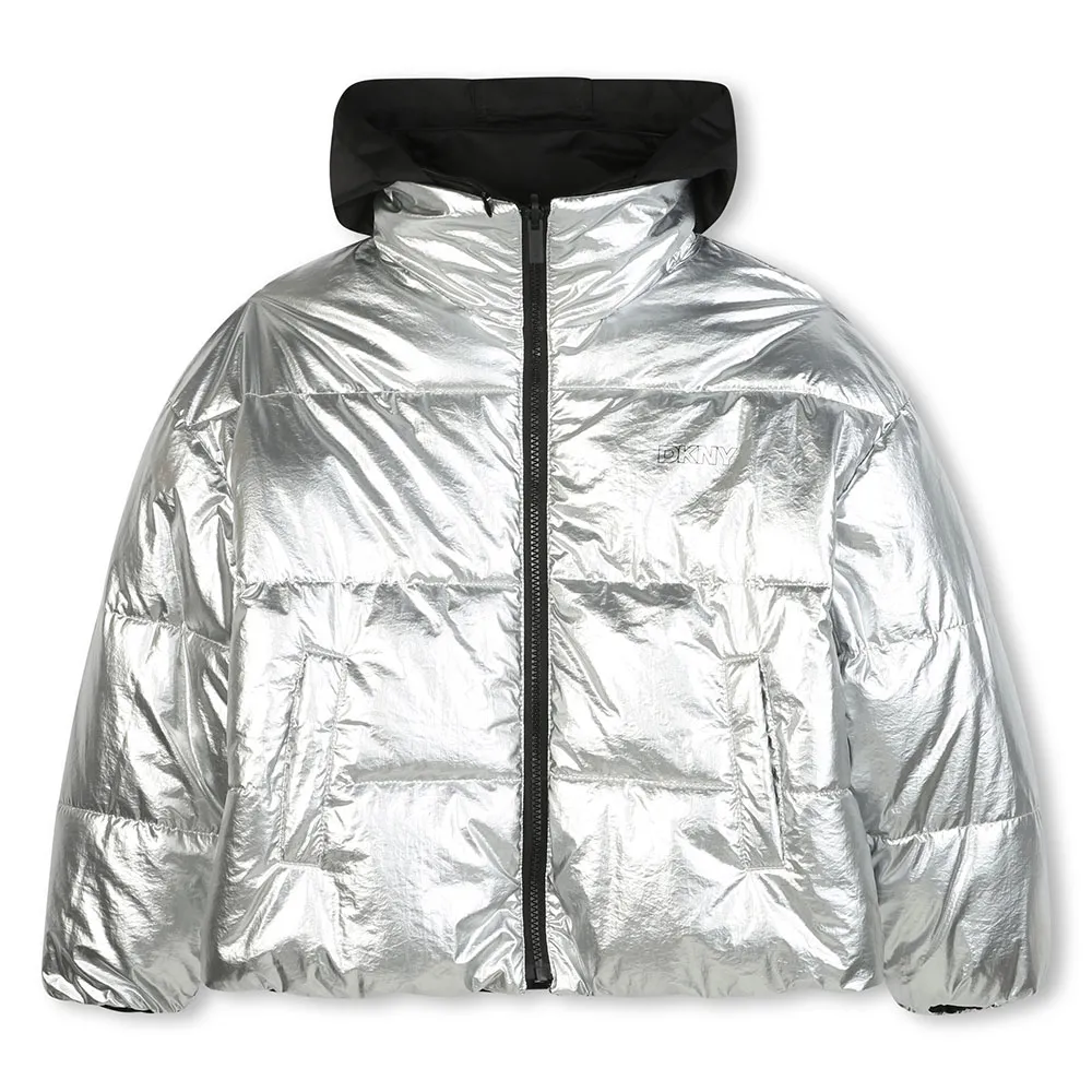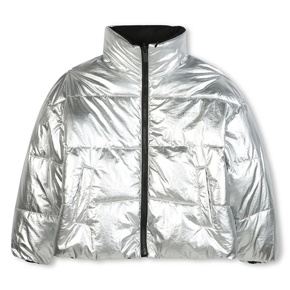 Um lado em poliamida prateada, 2 bolsos frontais, logótipo DKNY estampado no peito, logótipo DKNY acolchoado nas costas.
