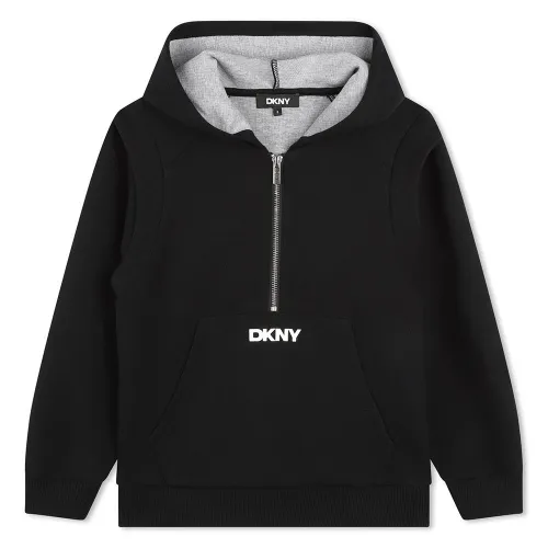 Este hoodie DKNY apresenta vários acabamentos originais. Os ombros e as cavas têm aplicações. Possui fecho de zíper e exibe o logotipo da DKNY no bolso canguru. Este modelo unissex, feito principalmente de algodão, tem um forro contrastante.