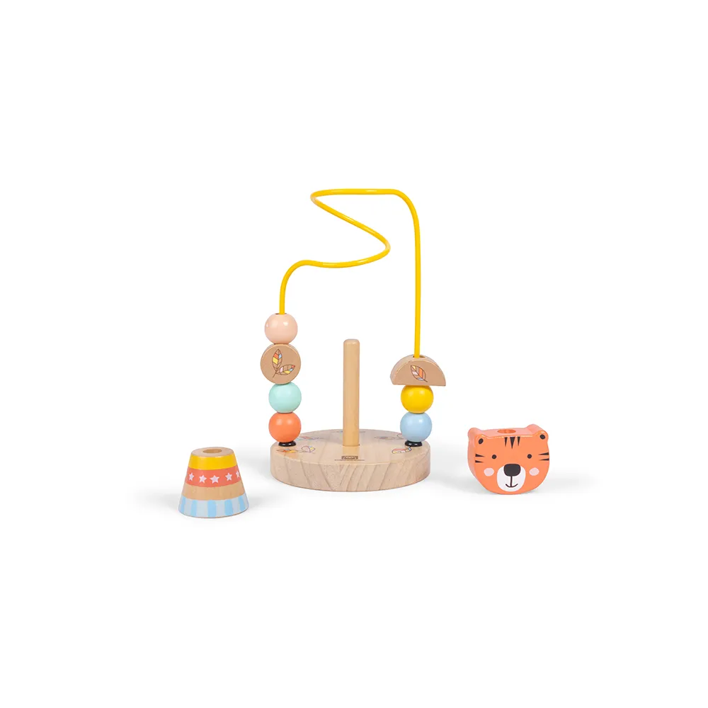 - Brinquedo de madeira com duas opções de jogo: looping de contas e jogo de empilhar.