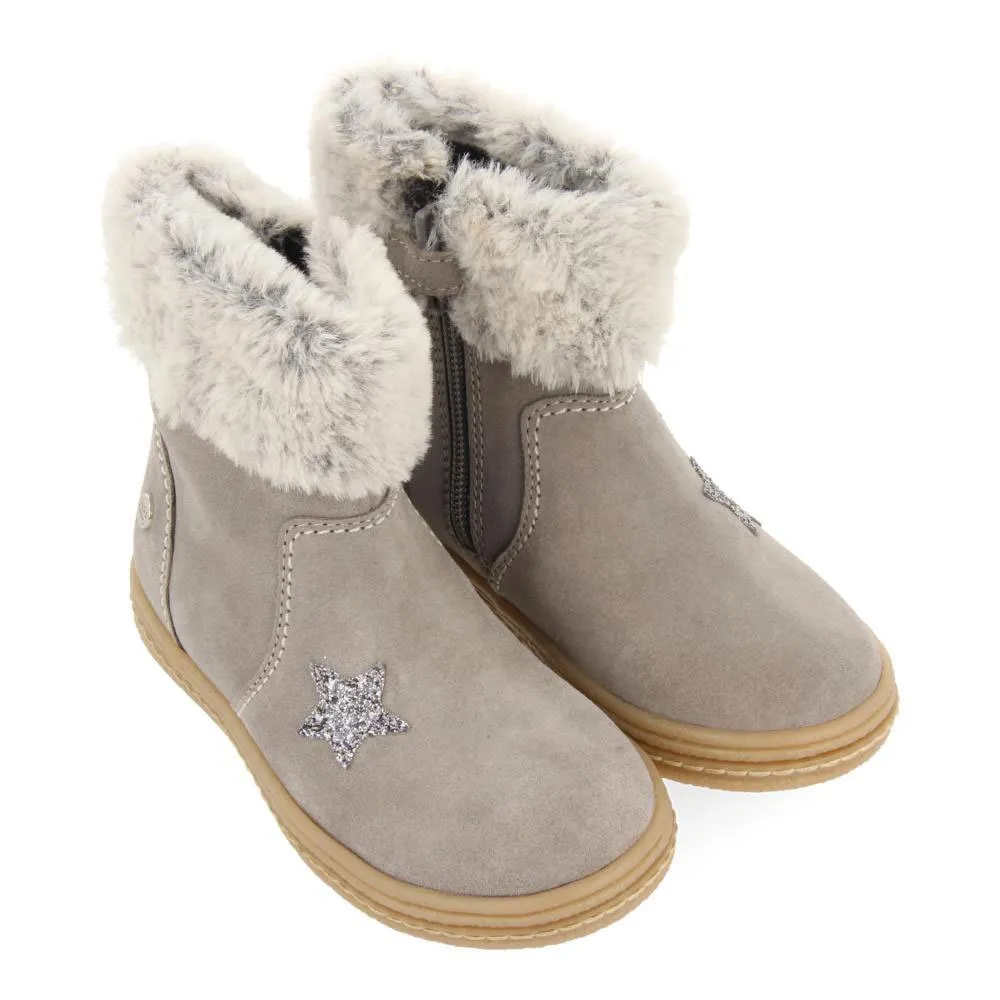 O frio não vai impedir você de arrasar com estilo! Botins em camurça cinza com glitter e pelo.