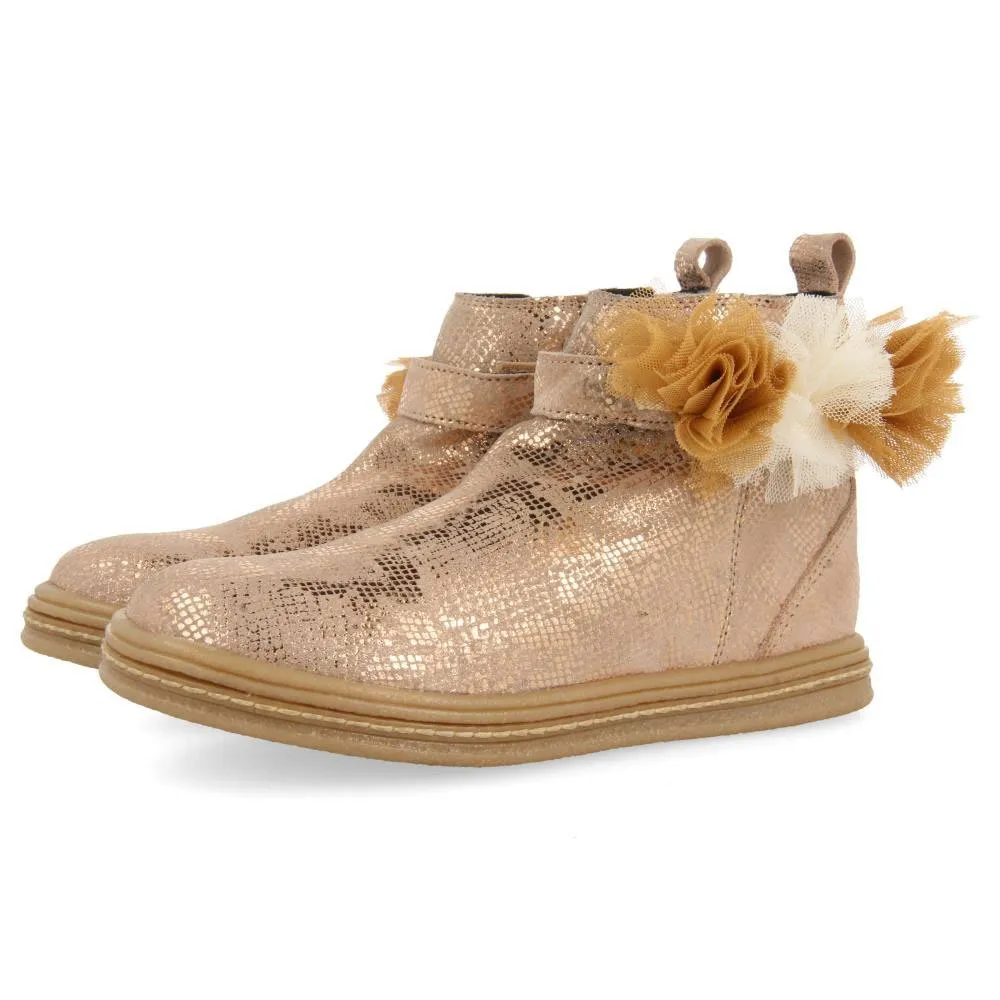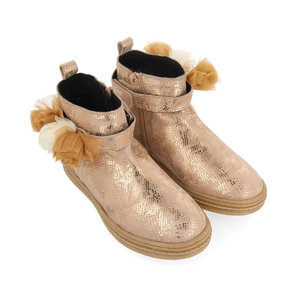 Botas de tornozelo em couro rosé gold com textura e decoração floral.