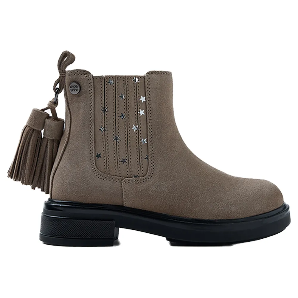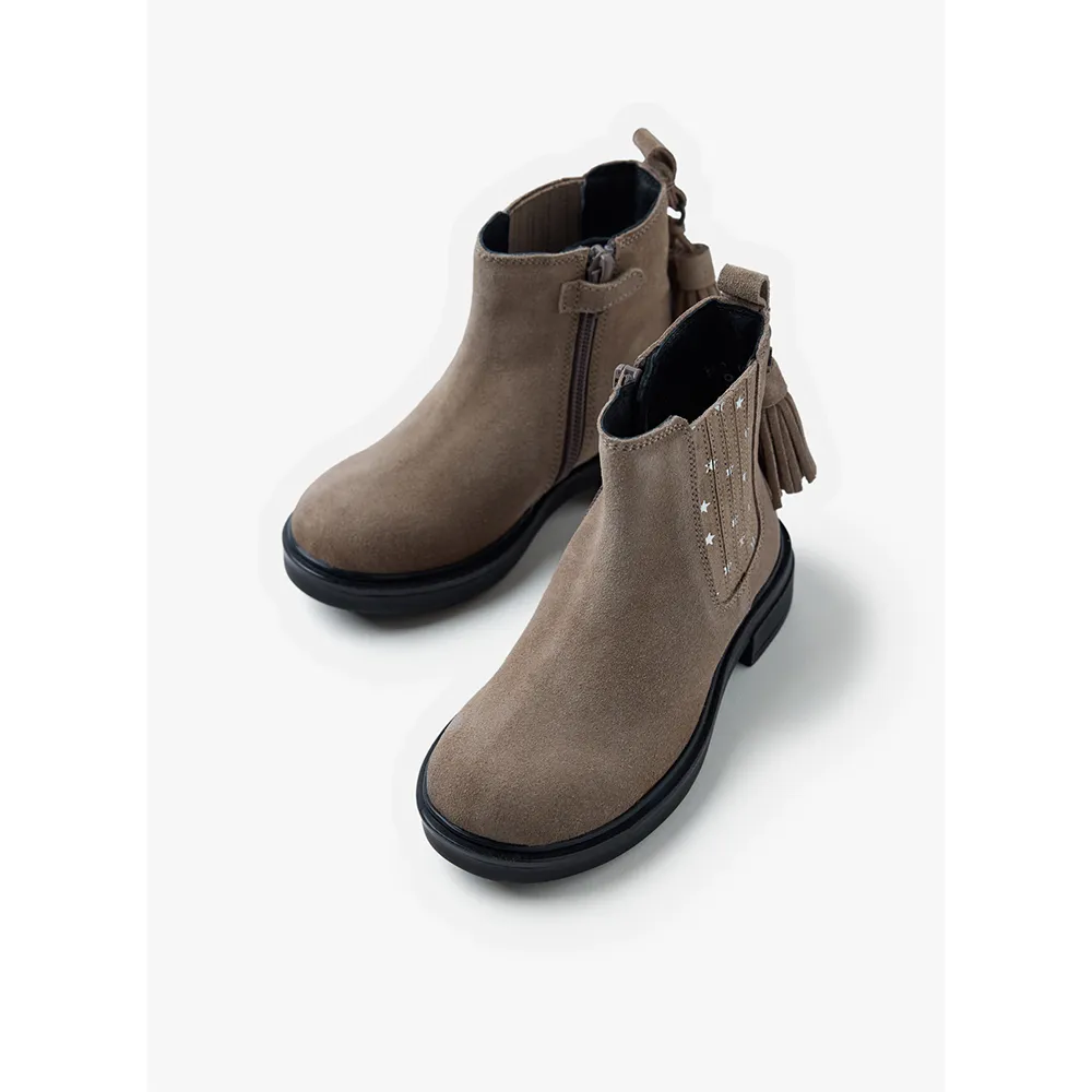 Botas Chelsea feitas de couro camurça com estrelas metálicas e decoração de tassel.