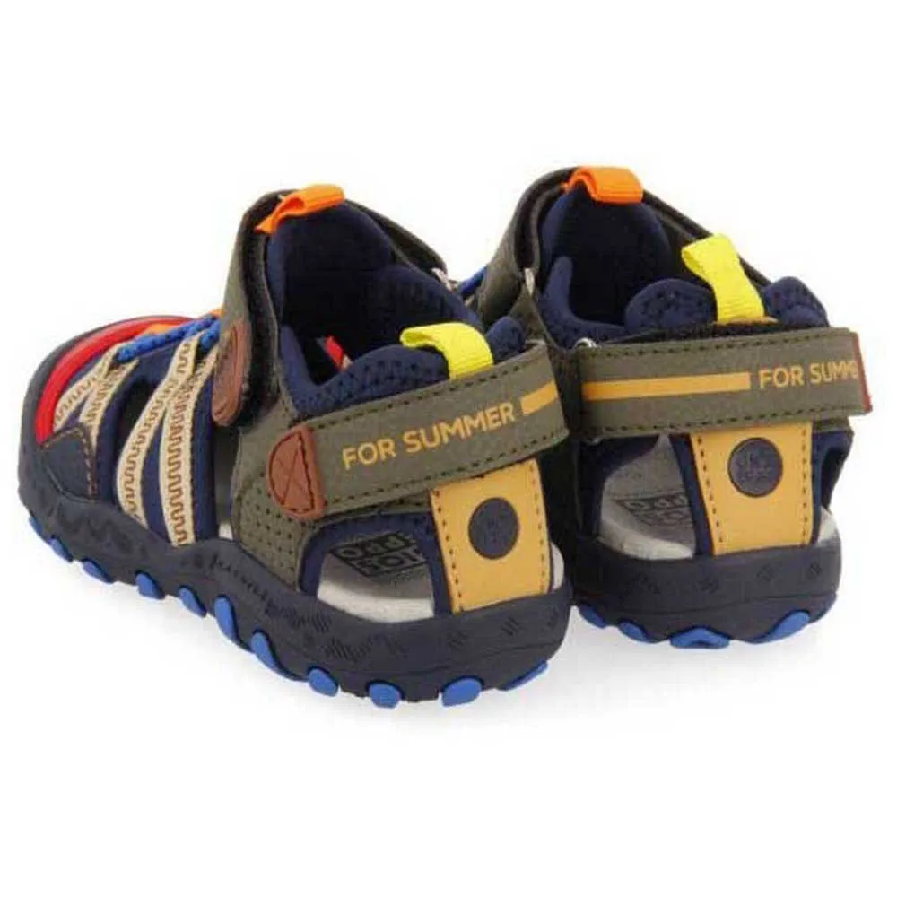 Use Gioseppo Kids neste verão! Sandálias esportivas com fechos ajustáveis no calcanhar. Feitas de materiais técnicos e com tiras de nylon em tons de cinza e azul marinho com detalhes em vermelho. Solas leves de TPR azul e palmilhas acolchoadas muito macias. O forro e as palmilhas são feitos de poliéster