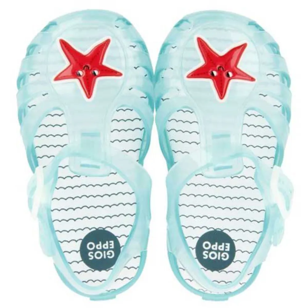 Patinhos na água! Sandálias de geleia turquesa com um adesivo de estrela na parte superior.