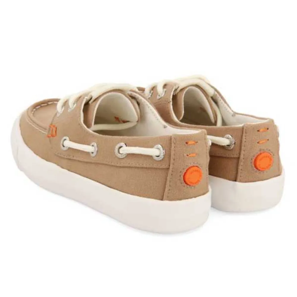 O cabedal é em lona e a sola é em borracha branca com fundo caramelo.