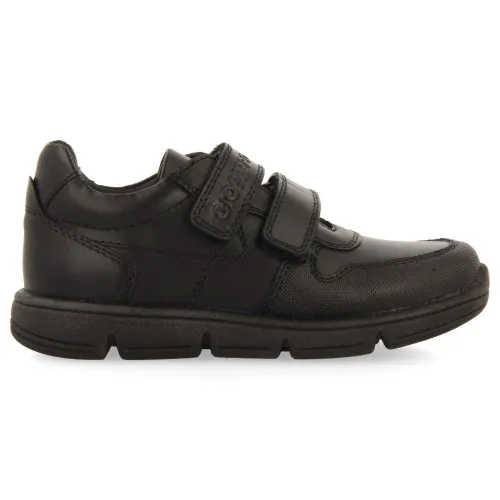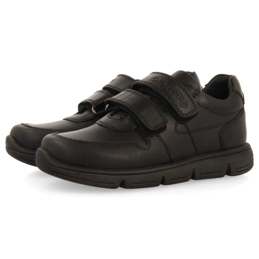 Tênis escolar em couro preto com fechos ajustáveis.