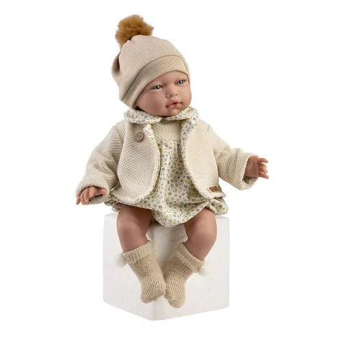 Usa um macacão bege com gola bebé com estampa floral, jugo de lã bege, casaco de lã bege com botão de madeira para amarrar, meias de lã camelo com pompom bege e gorro de lã bege com pompom castanho.