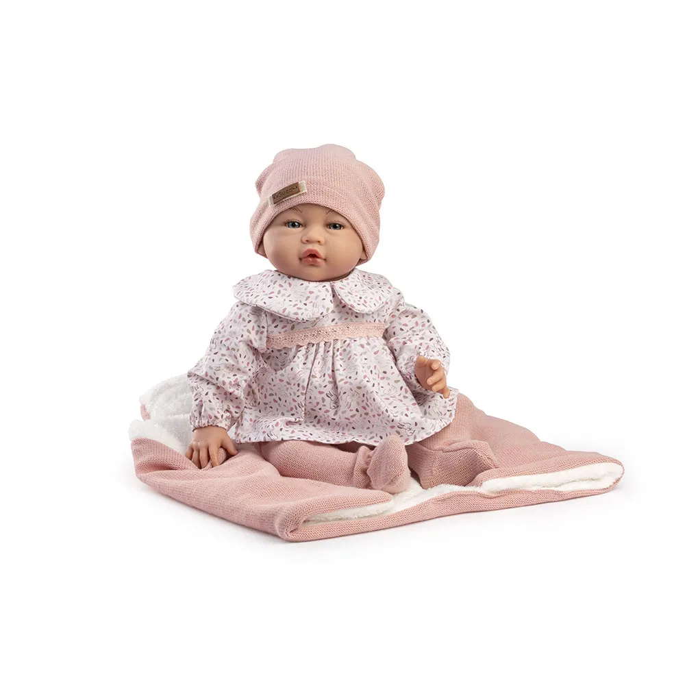 Seu chapéu combinando com sua manta reversível é feito de lã rosa pó.