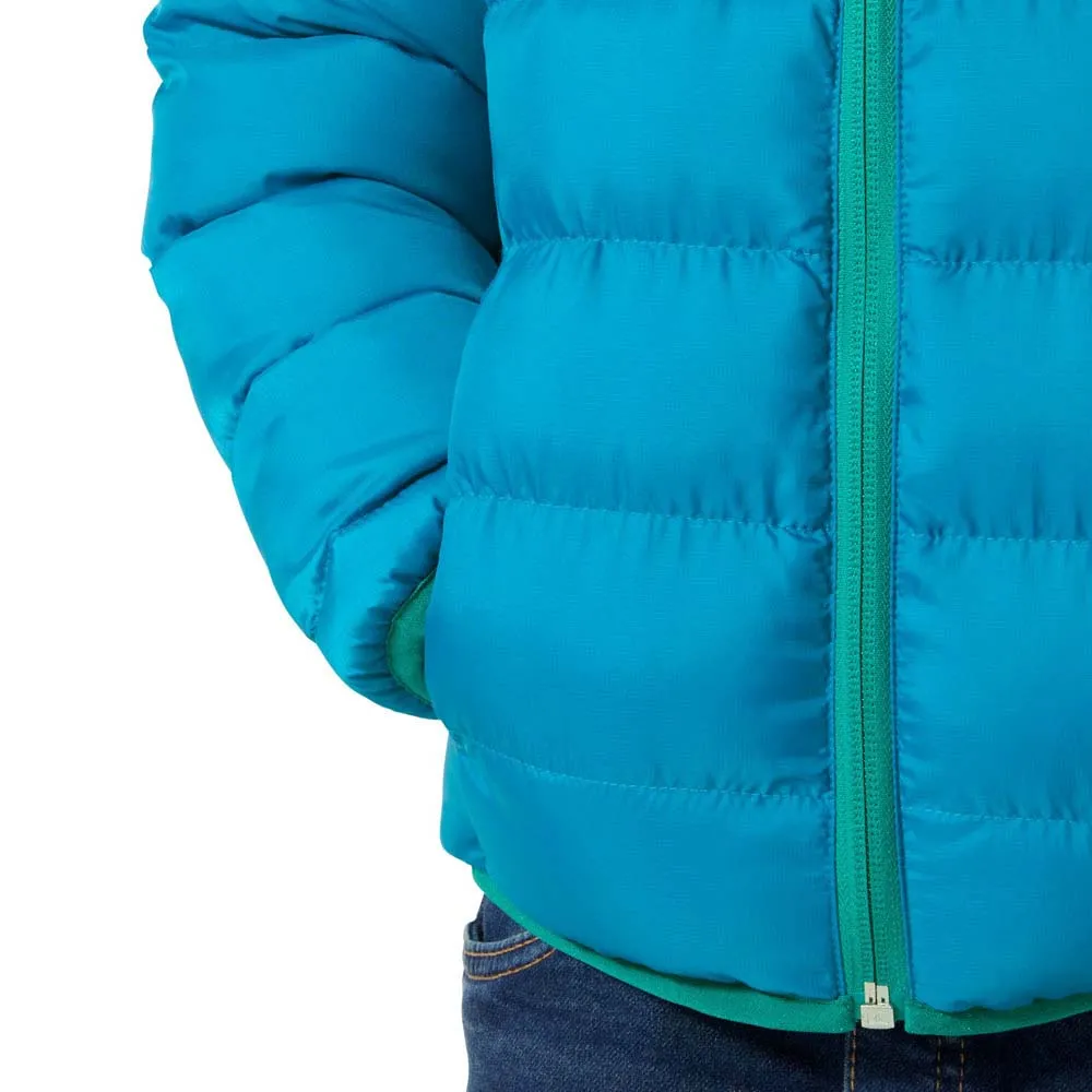 Uma jaqueta puffer reversível para crianças que vem com uma pequena bolsa para guardar e é altamente versátil e leve.