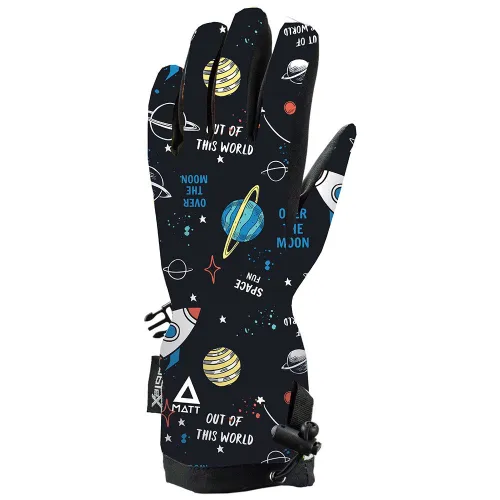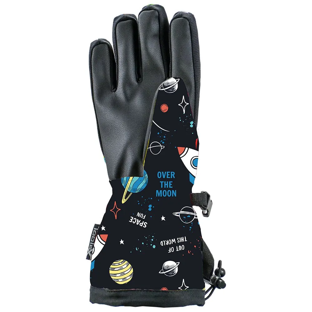 Luvas impermeáveis e respiráveis com membrana TOOTEX para crianças entre 4 e 6 anos; Ajuste no antebraço por um puxador elástico com stoper para obter um bom fechamento e que a criança não fique molhada; Isolamento térmico KWM soft; Forro interno em poliéster; Tecido externo em poliéster; Palma em couro sintético feito em PU; Possui uma faixa elástica anti-perda para prender a luva ao pulso, durante o uso e quando são retiradas; Totalmente estampada com design atrativo.