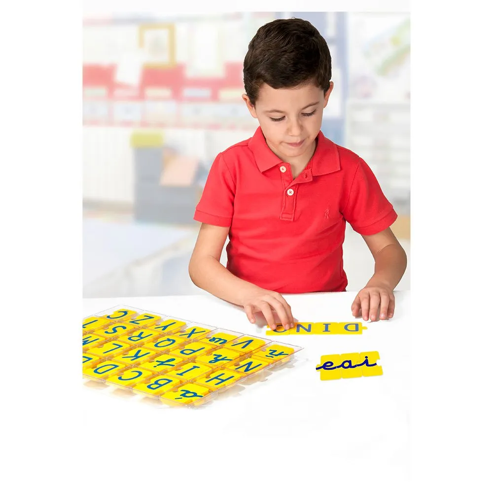 Fabricados em plástico, podem ser usados dos dois lados, um com letras maiúsculas e outro com letras miúdas unidas. De grande ajuda para a aprendizagem da leitura e da escrita, promovem o reconhecimento de letras para futura formação de ordens. Adaptado a diferentes idiomas e com sinais de pontuação. A base do caso permite arquivamento e classificação.