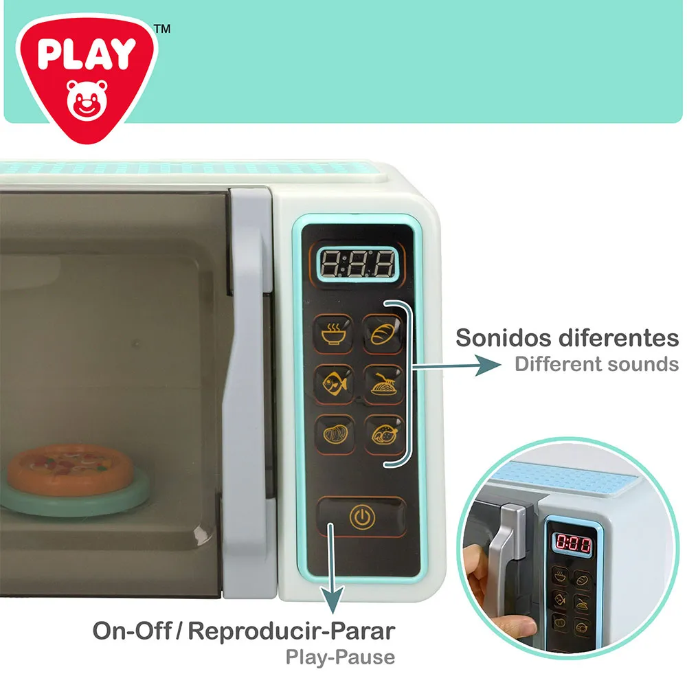 Cozinhe mais rápido com este brinquedo de microondas PLAY! Aperte os botões para selecionar diferentes modos de cozimento e espere que seu alimento esteja pronto para comer! Inclui uma bandeja giratória e uma mini pizza.