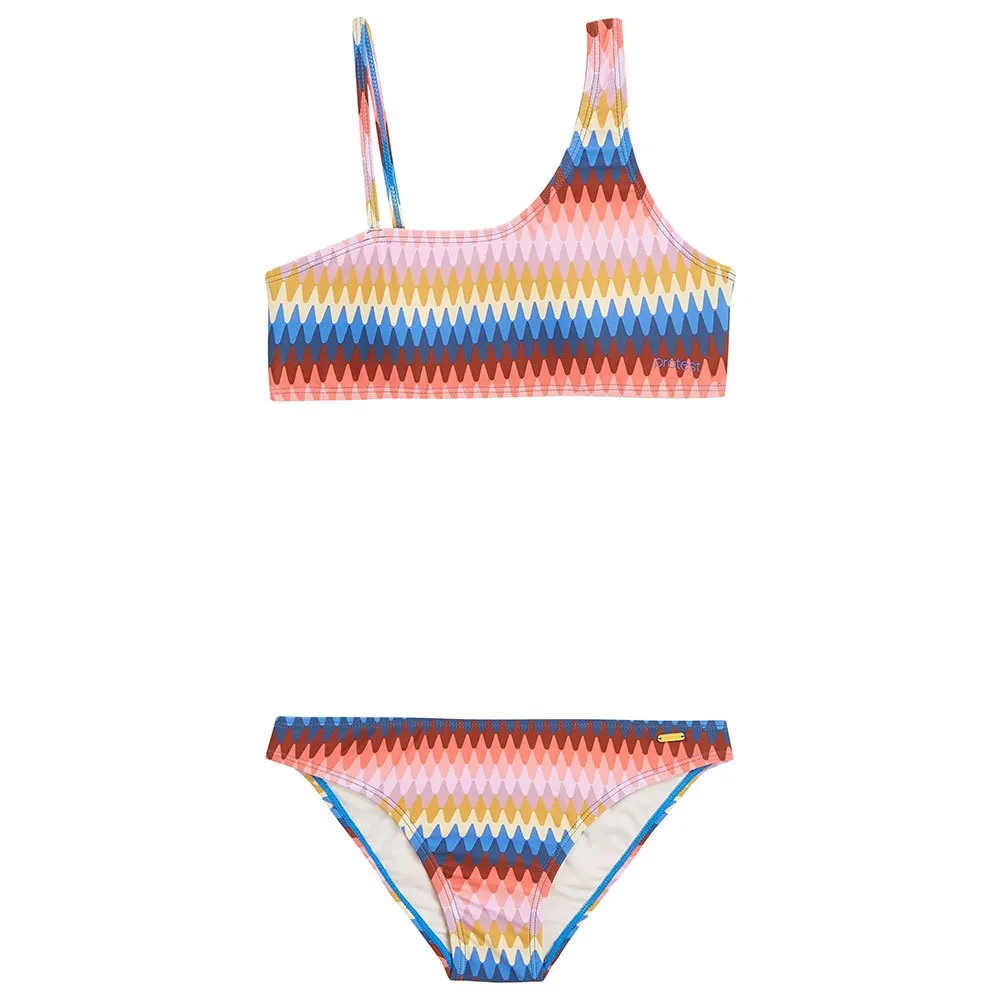 Procurando por um novo biquíni fabuloso? Então é hora de conhecer o PRTEVELIEN JR by Protest com seu design listrado incrivelmente colorido - é quase hipnótico! O top bralette tem uma alça mais larga que a outra, criando um visual ousado.