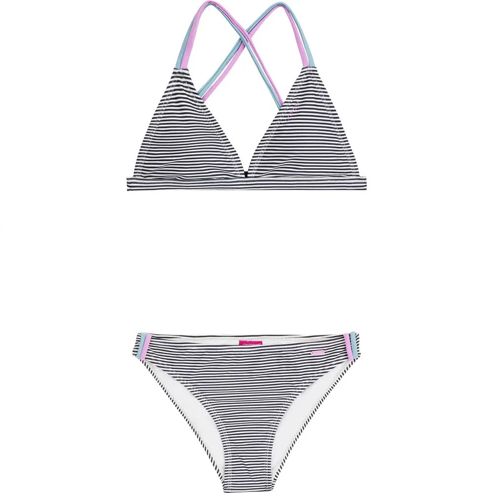 Este incrível biquíni triangular tem um visual fantástico graças à estampa listrada e ao acabamento contrastante.