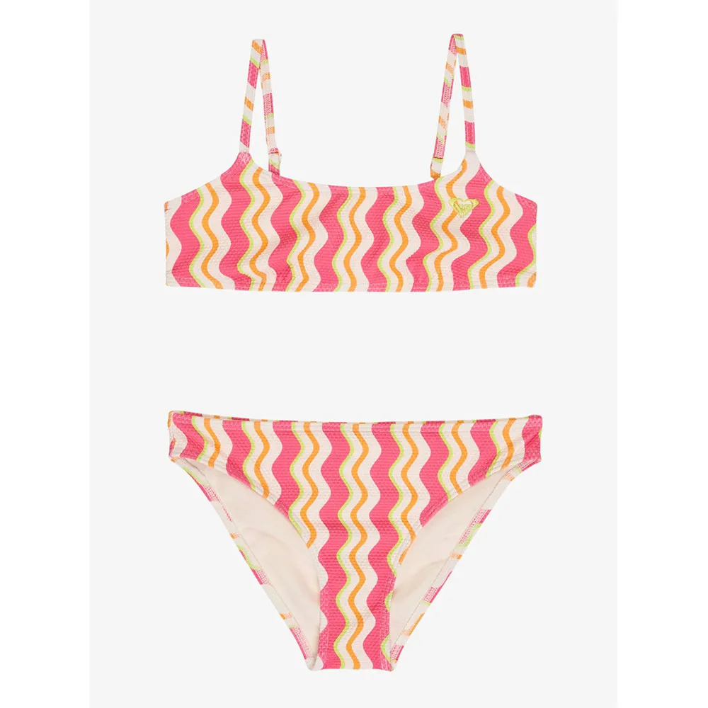 Fabric:Soft, recycled, resistant and stretch piqué textured fabric, Shape:Bralette set, Padding:Removable for 12-16 yrs., Straps:Adjustable straps with rings and sliders, Closure:Tie, Print placement may differ from one bikini to another, Embroidered ROXY logo, Fake knot on back of top.