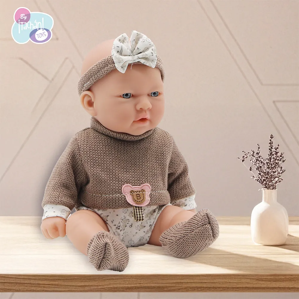 Com um design clássico e acolhedor, esta boneca de 26cm vestida com um conjunto de malha marrom é perfeita para brincadeiras de faz de conta.