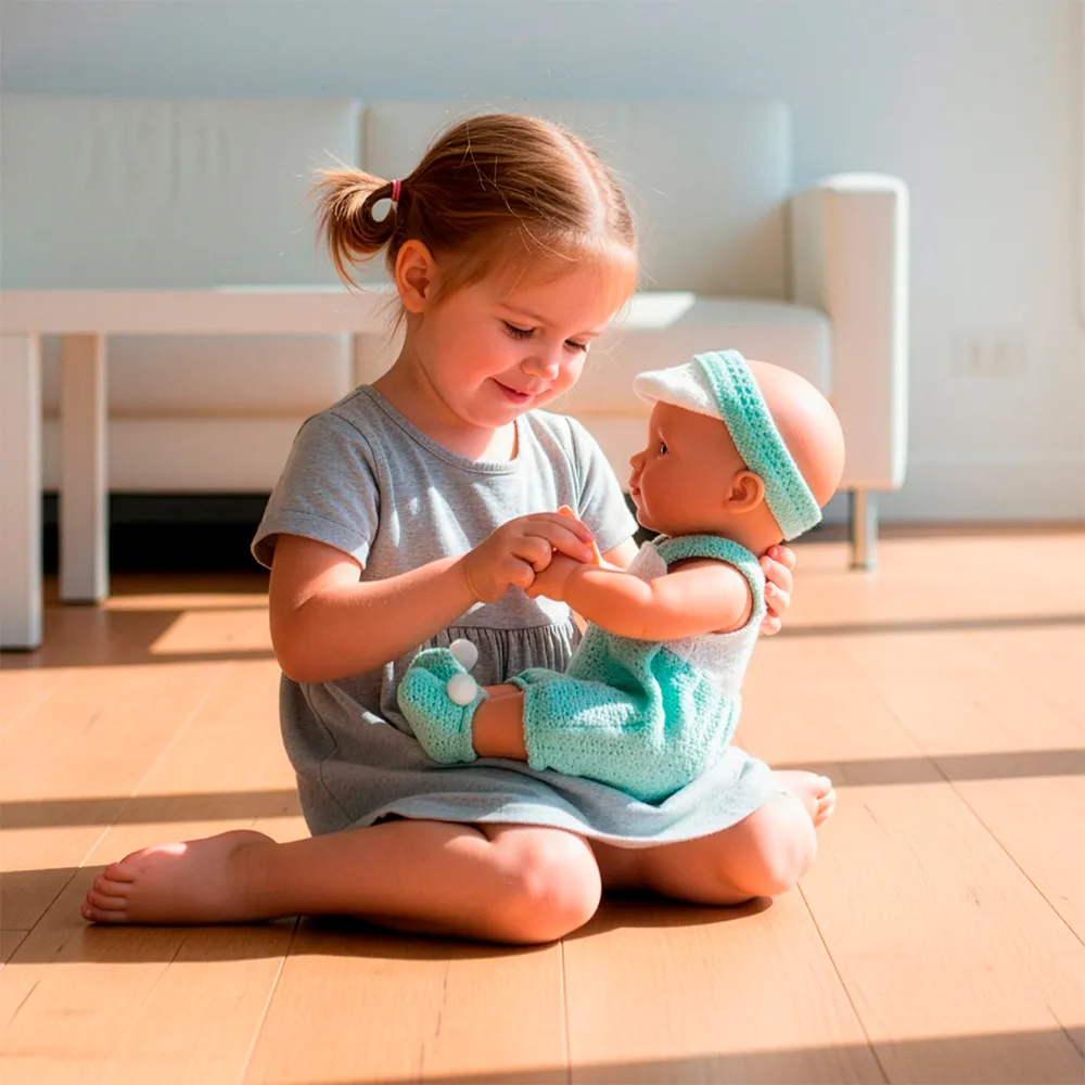 Esta boneca moderna e descolada de 26cm, com um conjunto verde menta e faixa de gorro combinando, é ideal para brincadeiras de faz de conta.