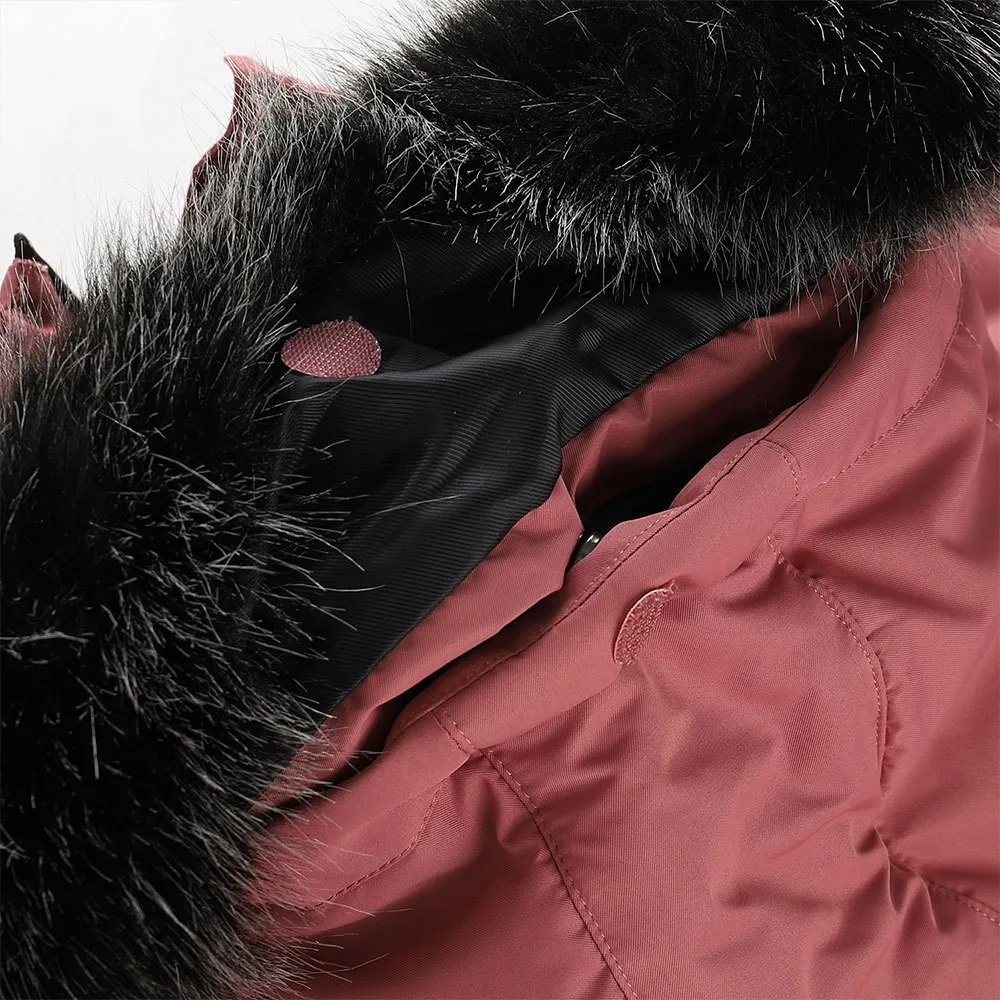 material vattentätt, ånggenomsläppligt, vindavvisande | materialfinish PTX-membran, vattenpelare 3 000 mm, ånggenomsläpplighet 3 000 g/ m2/ 24h, DWR | isolering tjock, varm | foder quiltat | passform normal | sömnad dekorativ | huva fastsydd | päls avtagbar | ärmar med ribbad mudd inuti | nederdel uppkavlad med resår | fickor totalt 2 | märke på ärmen.