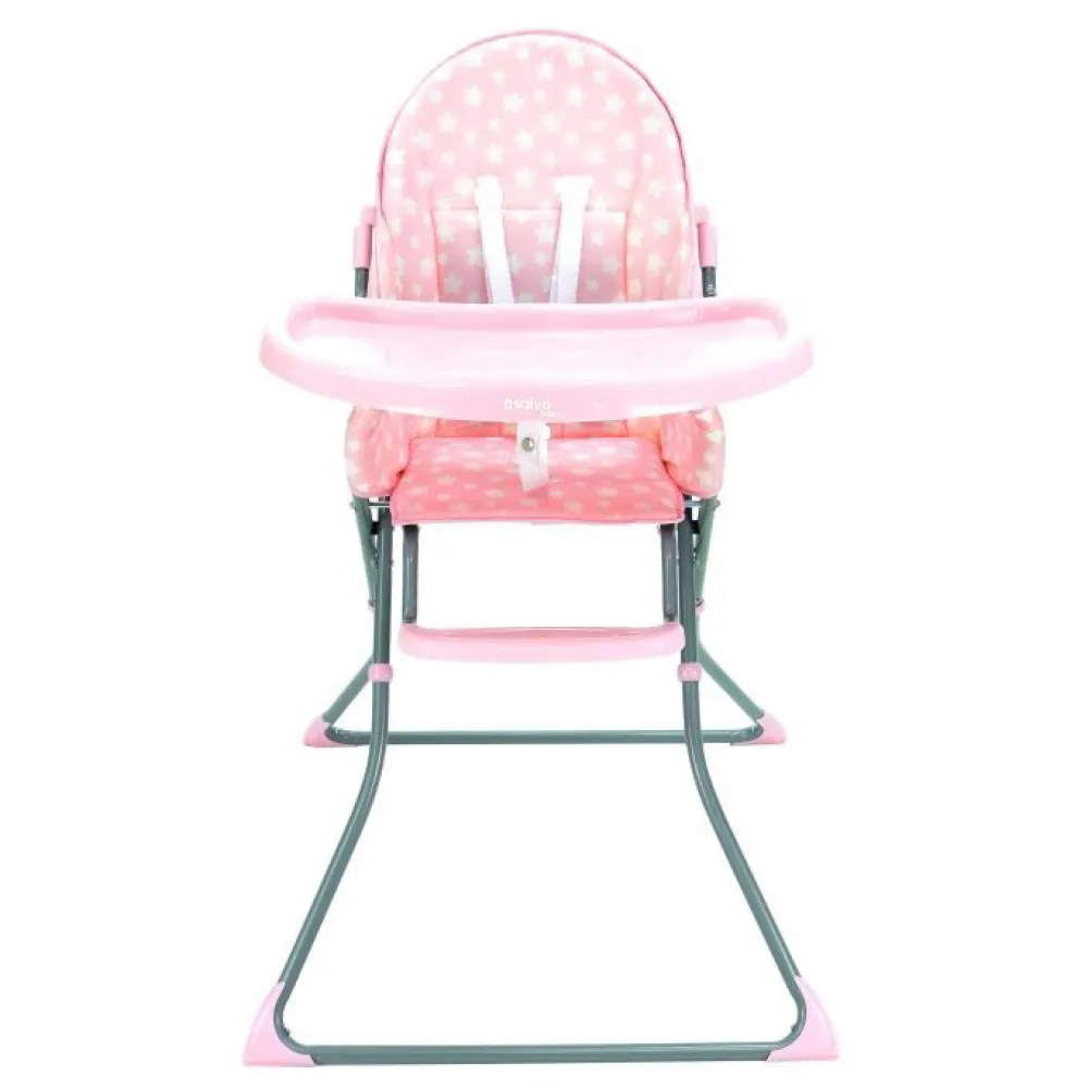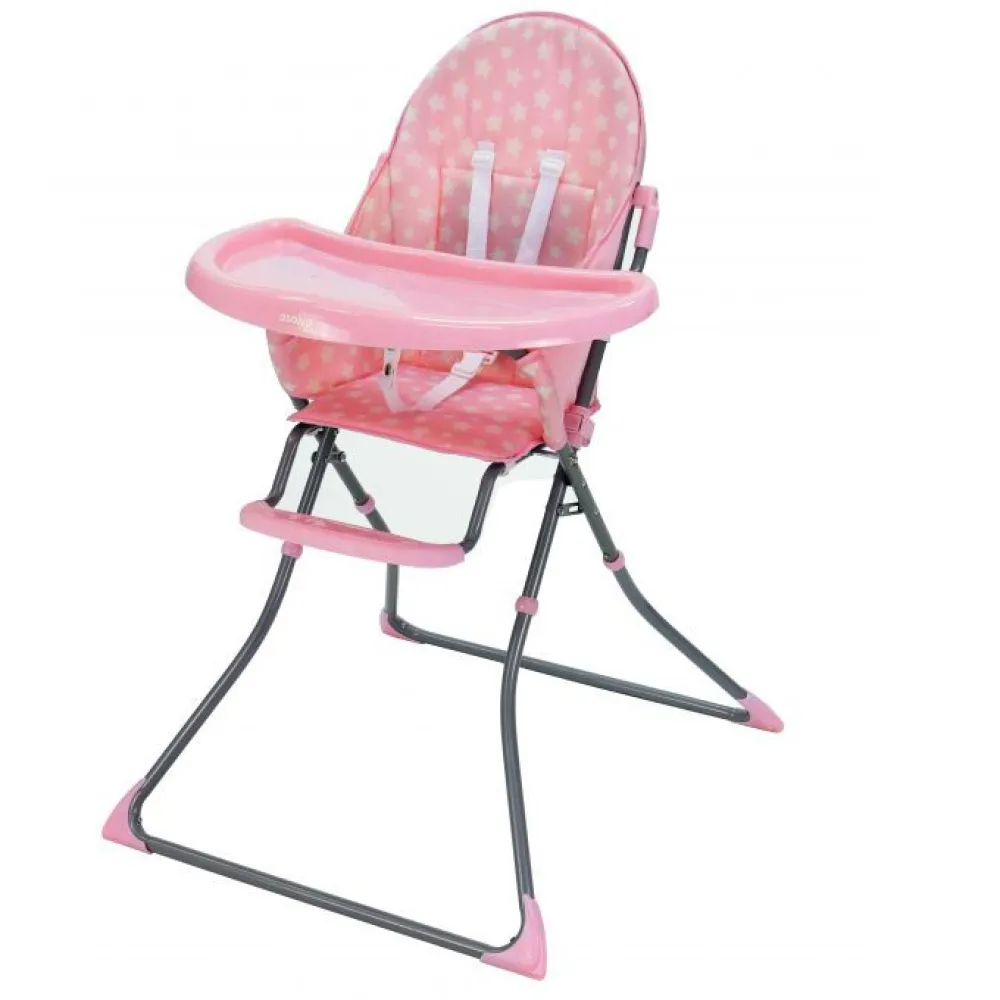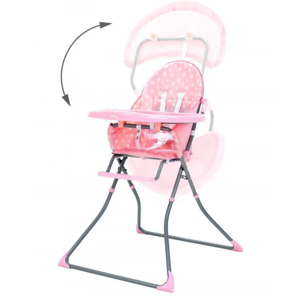 Den har ett fast ryggstöd, hopfällbar bricka, fotstöd och säkerhetssele.