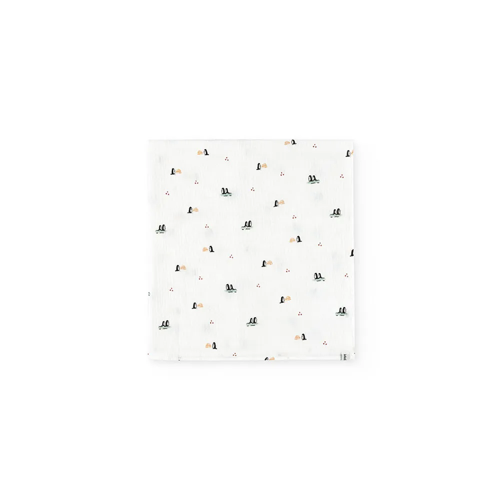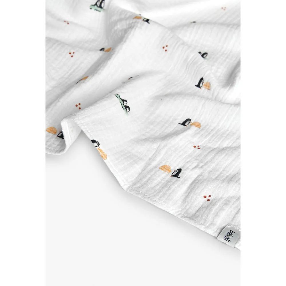 Stickad babypaket med pingvintryck, inklusive en mysig filt och matchande haklapp, perfekt för att hålla småttingar varma under de kallare månaderna.