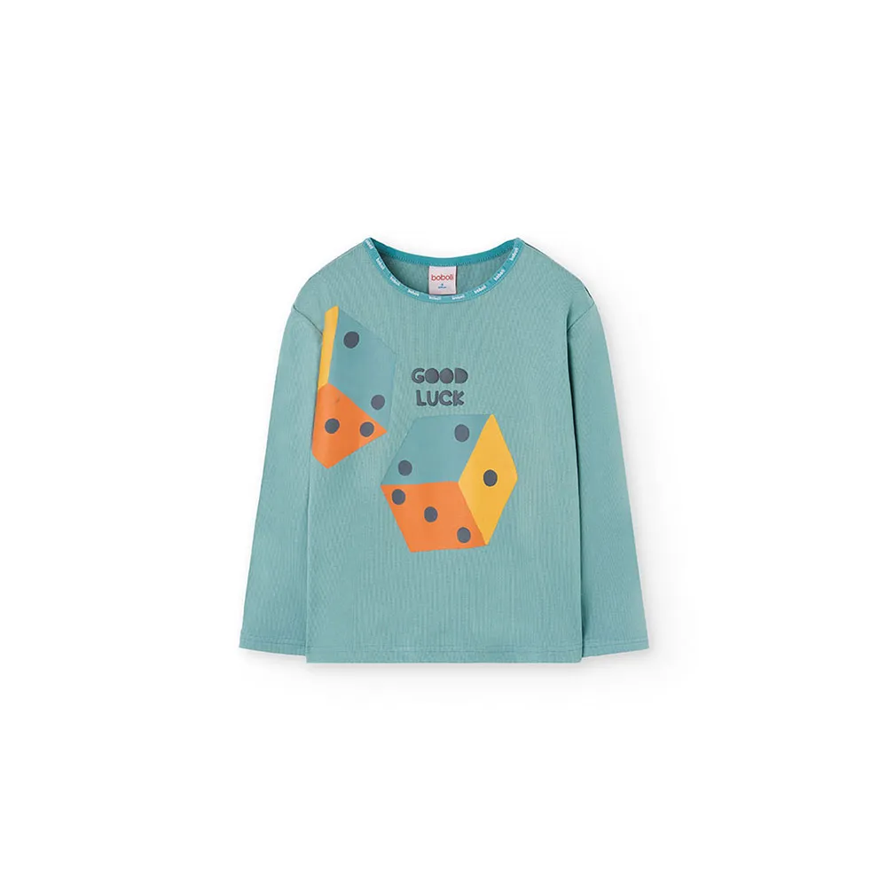 Setet har en lekfull design med tärningstryck på överdelen, medan byxorna har ränder i nyanser av grönt, orange och gult, vilket erbjuder en livfull färgpalett.