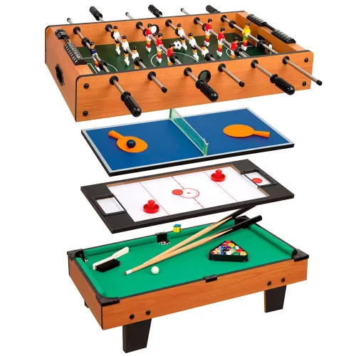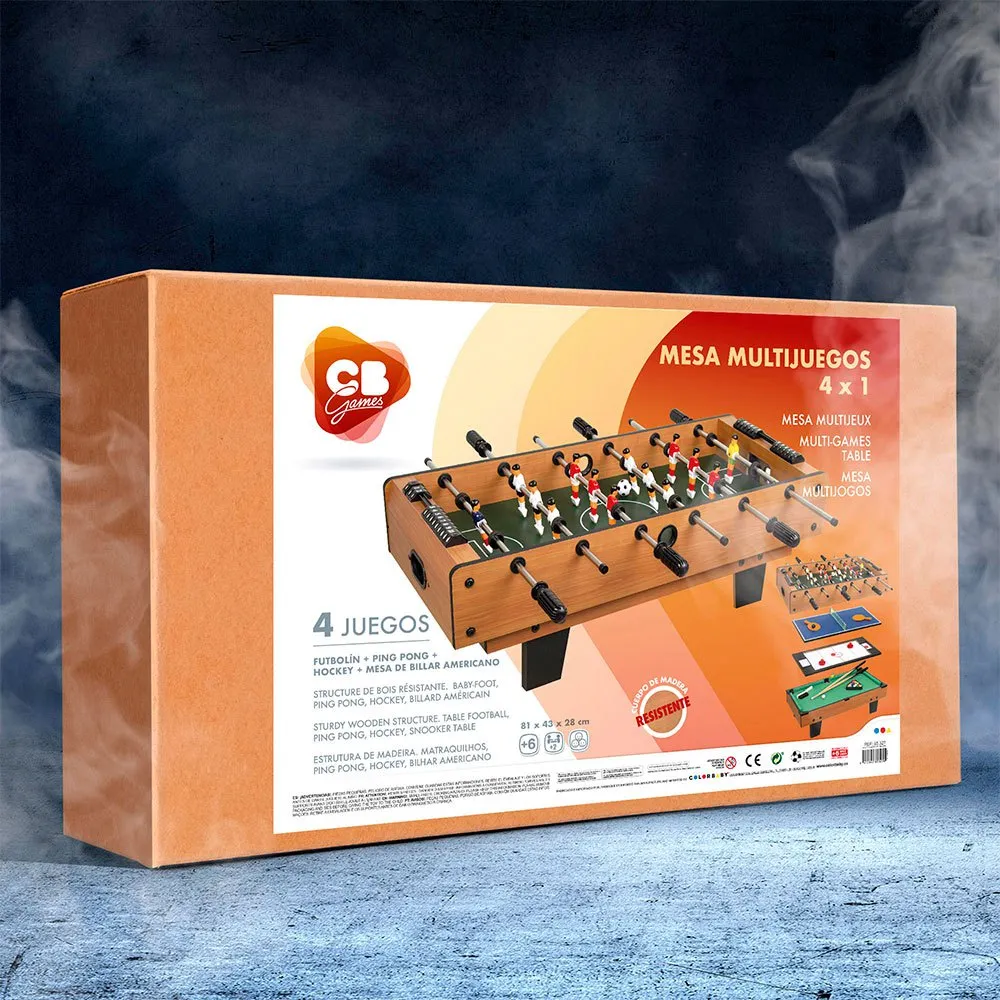 CBgames bordsspel för flera spel med träram och 4 spel med tillbehör Spela bordsfotboll, biljard, pingis eller hockey på samma plats. Basen för spelen är biljard och ovanpå det är resten av spelen inbäddade. Dess storlek är 79x43x67,5 cm och det rekommenderas för användning av personer över 5 år De klassiska retrospelen att spela som en familj utan att lämna hemmet.