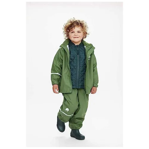 Setet finns som overall med justerbara elastiska hängslen (storlek 70-100) med en elefant och Celavi logga på bröst och ben.