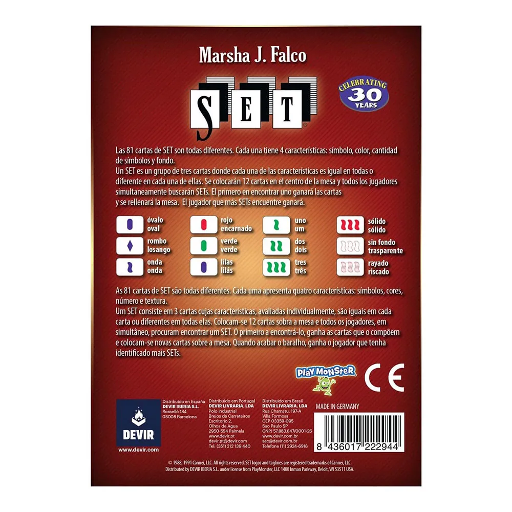 En SET är en grupp med tre kort där var och en av egenskaperna är desamma i alla eller olika i var och en av dem.