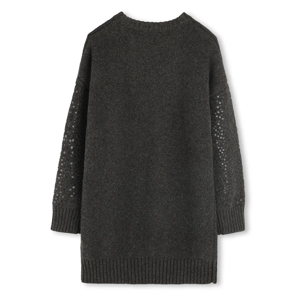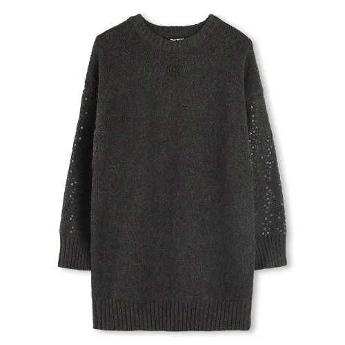 Enkel elegans möter lekfull charm i DKNY D62390-klänningen. Denna sofistikerade långärmade stickade klänning är designad för den unga fashionistan och erbjuder oöverträffad komfort i ett mjukt bomullsblandat tyg. Ett äkta "mini-me"-plagg som möjliggör chica koordinerade looks. Designen förhöjs med en touch av glamour från broderade paljetter som glittrar på ärmarna, medan en signatur-DKNY-metallplatta framtill bekräftar dess designerkvalitet. Perfekt för alla tillfällen är det ett stilfullt, varmt och bekvämt statement-plagg för hennes garderob