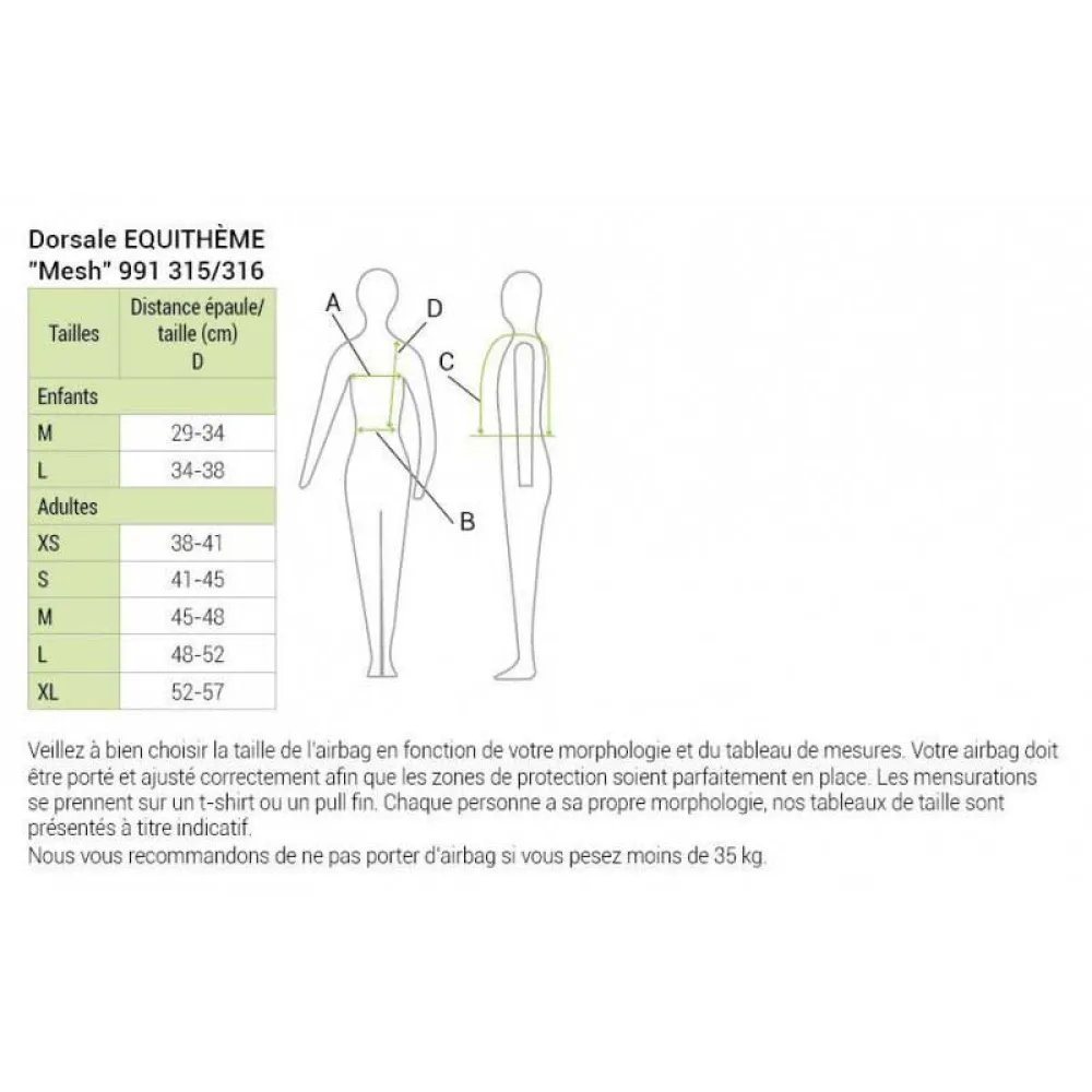 Ryggskydd bestående av en väst med dragkedja i 85 % polyamid och 15 % polyester vadderad med flera lager lätt och smidigt högdensitetsskum, försedd med ett elastiskt justeringsbälte. Avtagbart överdrag, handtvättbart: polyester. Vaddering i skum med hög densitet. OBS Överensstämmer med BS EN 1621-2:2014 Nivå 2 Motorcyklisters skyddskläder mot mekanisk stöt - Del 2: Motorcyklisters ryggskydd - Krav och testmetoder. Att den är avsedd för motorcykling betyder inte att den inte kan användas för ridsport, men den kan inte ersätta ett kroppsskydd som är testat och godkänt enligt EN13158:2018 Standard, som är avsett för ridsport.